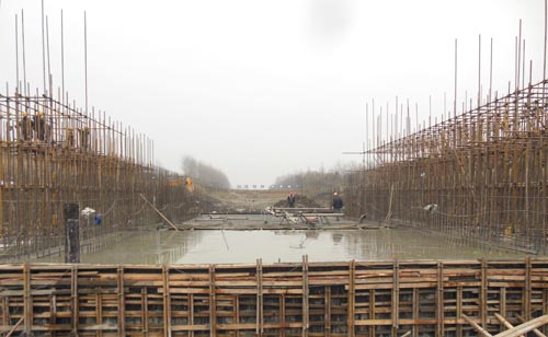 2016年1月1日晚7时,经过14天加班加点的连续奋战,仙桃市纯良岭闸室底板顺利浇筑完成。闸室底板为工程重点施工部位,分为左、右排水孔、通航孔三大块,总方量2500m3