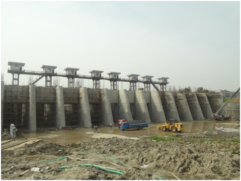 自2015年9月开工以来,新沟闸项目部经过科学组织与管理,加大施工投入,克服长时间雨雪冰冻天气及春节施工力量减弱等不利因素,高强度连续奋战8个多月,在第一个枯水期内全面完成12孔水闸水下主体施工。目前,已完成上游围堰填筑13596.2m³;临时工程建设(包括临时道路、施工厂房及仓库);老闸挡土墙及铺盖拆除5469.5m³;基坑清淤4767.14m³、排水71165m³及基础处理(水泥土搅拌桩23613.1m³);新闸闸室底板、铺盖、上游段护坡、右岸挡土墙、闸墩、胸墙及工作桥,其中混凝土浇筑约2.1万m³,钢筋制安约1600t。