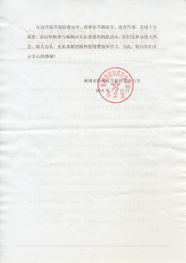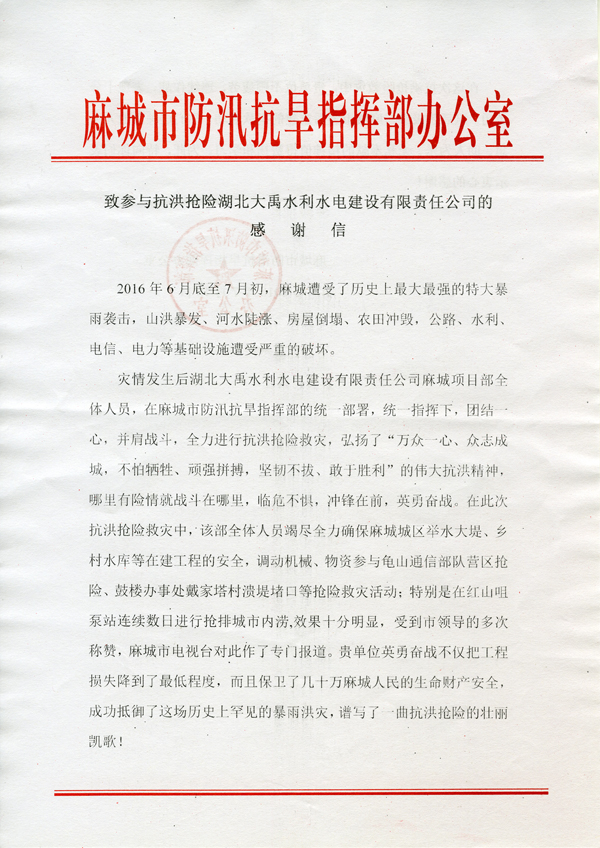 麻城市防汛抗旱指挥部致公司参与抗洪抢险感谢信