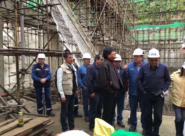 莫拉莱斯总统一行深入厂房,与正在紧张施工的中方和玻方工人挥手致意,察看并详细询问了工程进展情况。他指出,圣何塞水电站项目将大大改善整个玻利维亚,尤其是科恰班巴地区电力紧缺的情况。讲话中,总统对建设方按时完成项目建设并最终服务于玻利维亚人民充满信心。