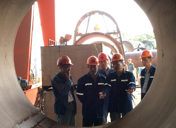 余中平一行前往钢管加工厂考察,察看厂区设备和工作环境,了解压力钢管的工艺流程。