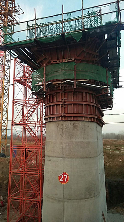 沙河渡槽总长1.38km,槽身支撑结构为重力墩接混凝土灌注桩形式,槽墩由帽梁、墩身、承台、桩组成,最大墩高14m,平均墩高6m。除Z27槽墩为空心重力墩外,其余槽墩全为实体墩。承台长12m,宽7.5m,厚2.5m,每个承台下设6根直径1.5m的C25砼灌注桩,桩长16-20m,中心距均为4.5m。Z27号墩身分8次浇筑,共浇筑C30混凝土250m³。