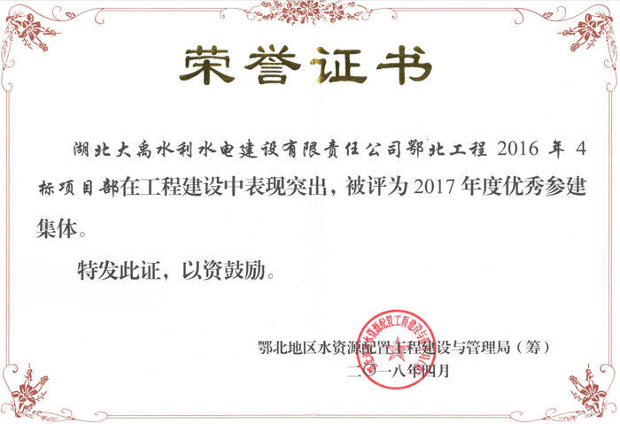 喜讯:鄂北工程2016年4标喜获优秀参建集体称号