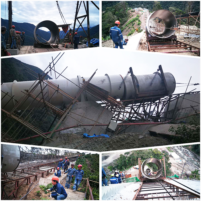 玻利维亚当地时间6月20日下午16时,随着运输压力钢管的组合平车在轨道上平稳运行数百米抵达预定位置,圣何塞2级水电站成功通过轨道完成压力钢管的安装就位工作。圣何塞2级站用于钢管安装的轨道全长约450米,包含5种坡度变化和2处横向空间转弯,为保证运输平车的安全平稳运行,项目部在轨道安装前进行了周密的推演计算,力图保证轨道各处平滑过渡,此次成功安装验证了推演计算的正确性,项目后续400余米压力钢管亦将以该方式进行安装。