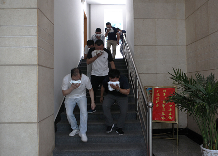 演练开始,“着火啦!”员工发现火情,指挥组立即报告给领导小组,领导小组启动应急救援预案,并通知拉响警铃,疏散引导组组织人员撤离火灾现场,大家用湿毛巾捂住口鼻避免浓烟进入,弯腰前行,最后全员安全撤离,后勤医疗保障组对人员疏散过程中出现的伤员进行包扎和处理。