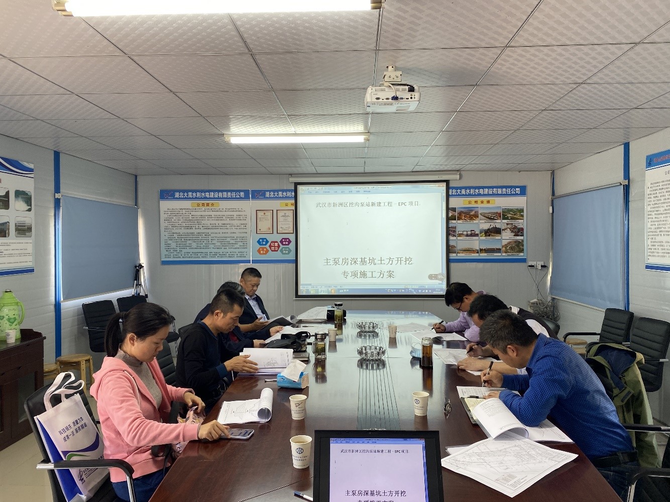为保证挖沟泵站基坑开挖顺利进行,项目部编制了基坑专项施工方案。2020年11月10日下午,项目部邀请了湖北水利水电职业技术学院钟汉华教授,武汉大学佘成学教授,华中科技大学李小青教授,中冶集团武汉勘察研究院有限公司赵旭荣正高级工程师,中国地质大学卢春华副教授5人组成专家组,对主泵房基坑专项施工方案进行了评审。另外项目法人徐国平,总监理工程师何胜良,项目负责人郭祥初,勘察负责人曹雪芹参加了论证会。