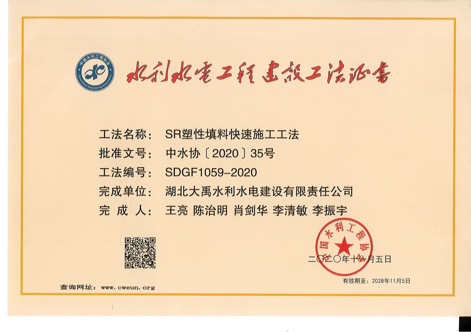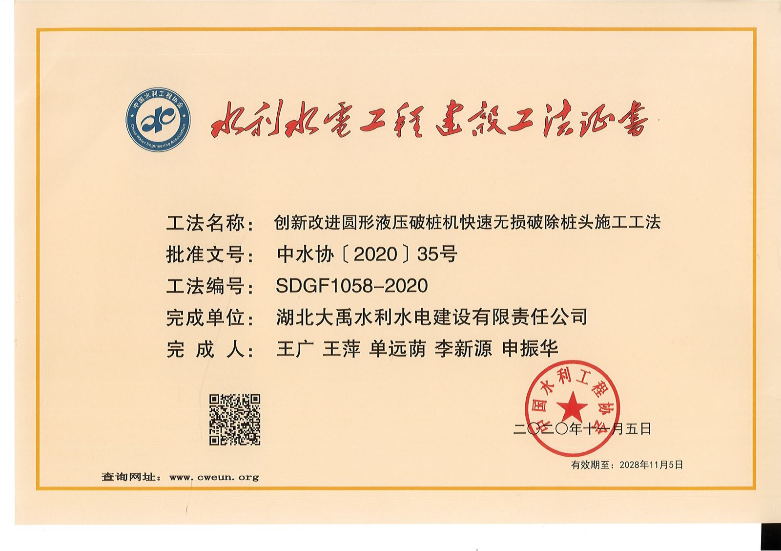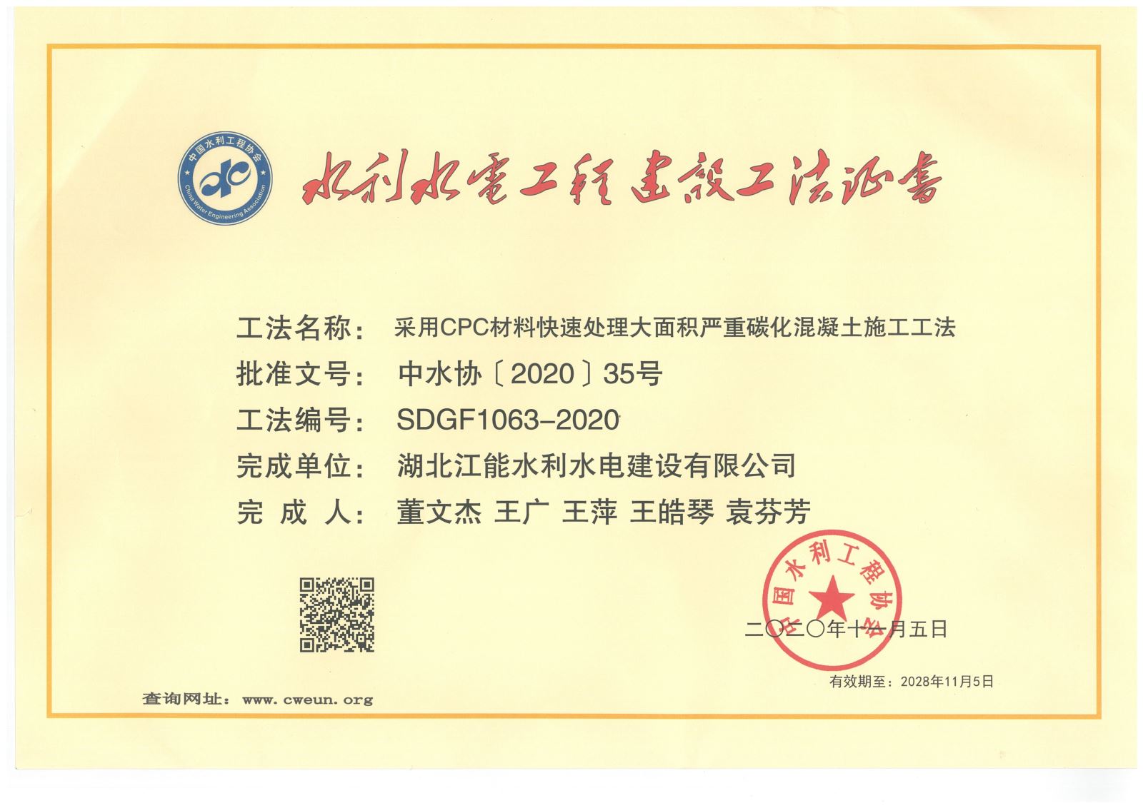 11月5日,中国水利工程协会发布《关于公布2020年度水利行业工法的通知》(中水协[2020]35号)。2020年度,公司共申报了四项工法(含湖北江能公司一项),公司申报的湖北省碾盘山水利水电枢纽工程泄水闸施工及金属结构安装工程《创新改进圆形液压破桩基快速无损破除桩头施工工法》、湖北省鄂北地区水资源配置工程(第3标段)2015年度第一批项目袁冲暗涵-孟楼倒虹吸工程 《SR塑性填料快速施工工法》及湖北江能公司《采用CPC材料快速处理大面积严重碳化混凝土施工工法》等三项工法被评为2020年度中国水利行业工法,并颁发了水利水电工程建设工法证书,这是公司连续多年荣获水利行业工法;襄阳市东津新区肖坡河等水系治理工程申报的《沉入工作井及顶管施工方法解决复杂环境下管线施工工法》通过了企业工法备案。