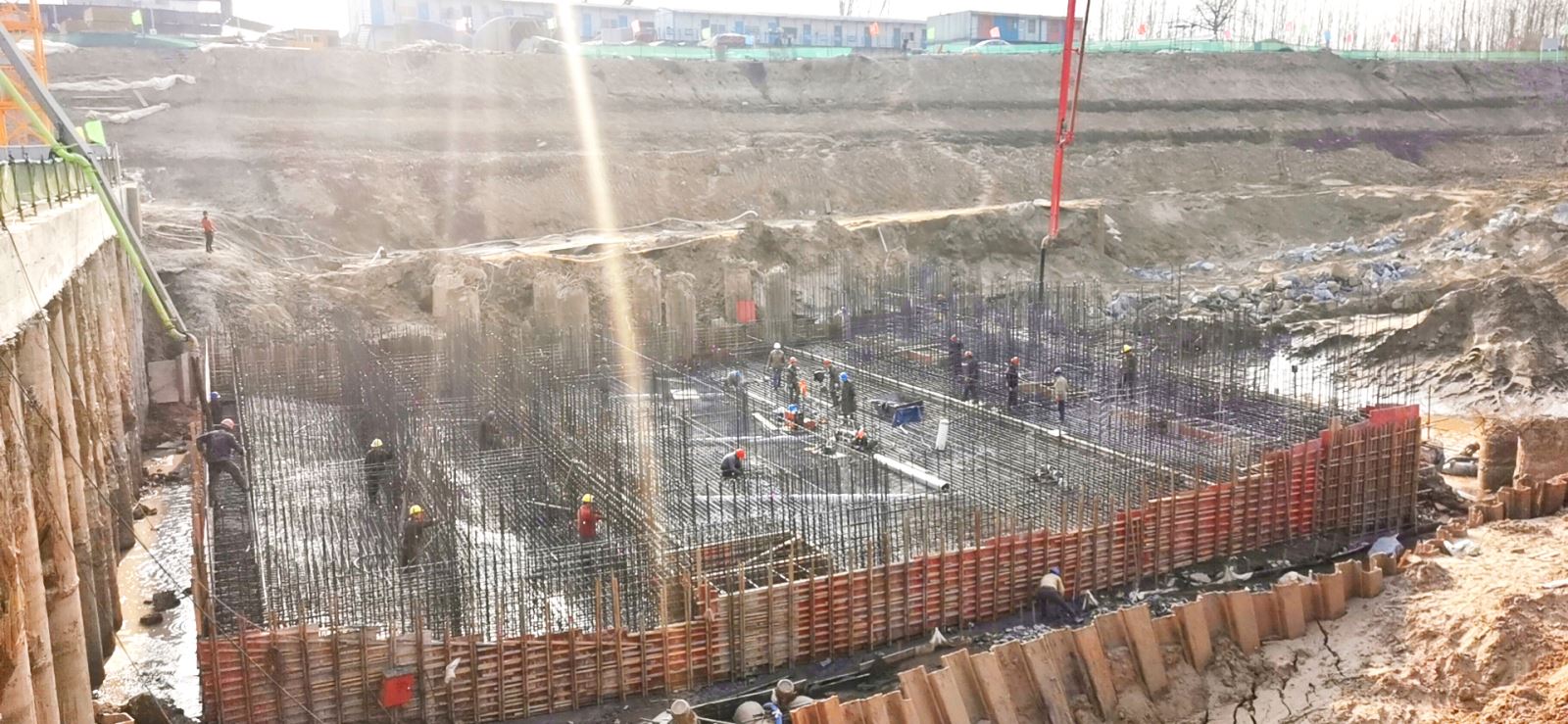 为保证主泵房底板混凝土浇筑顺利进行,项目部于2021年1月14日晚召集管理人员及施工班组召开了技术交底会,安排底板混凝土浇筑事宜。2021年1月15日9:00,主泵房底板混凝土浇筑正式开始,现场共有混凝土泵2辆、商混车10辆进行作业。由于准备充分,安排合理,混凝土于1月16日凌晨1:40浇筑完毕,历时16小时40分钟。