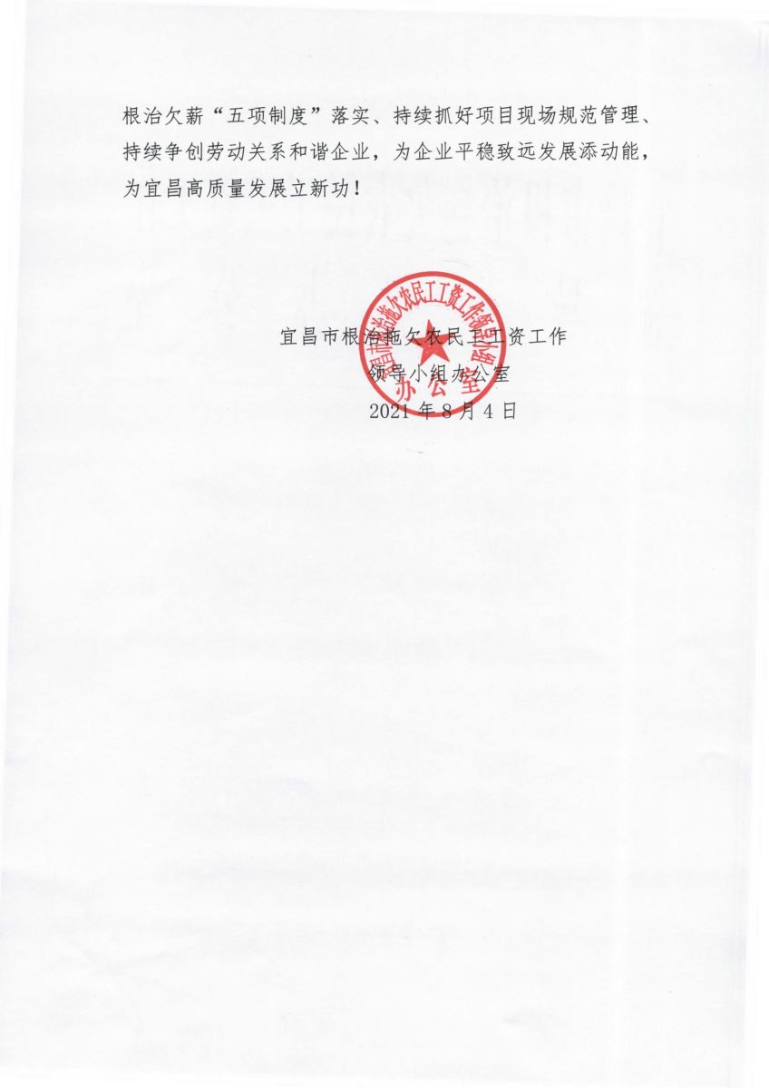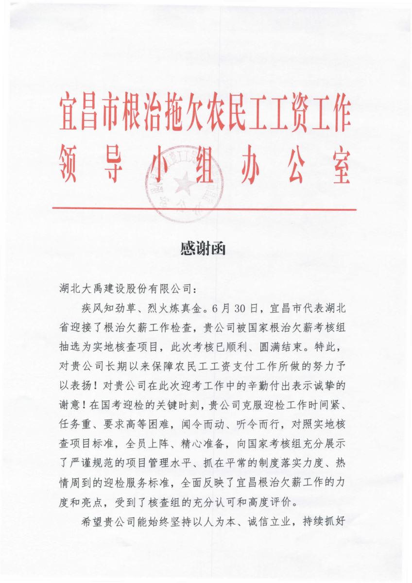 对此,宜昌市根治拖欠农民工工资工作领导小组办公室发来感谢函,对我公司长期以来保障农民工工资支付工作所做的努力予以表扬。