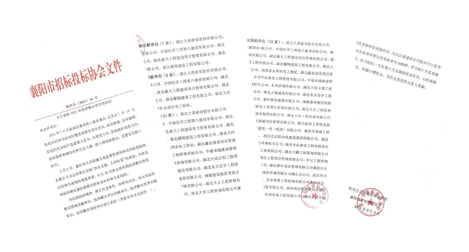 8月2日,襄阳市公共资源交易监督管理局和市招标投标协会联合号召会员单位发扬“洪水无情,人间有爱”的真谛,为鱼泉河村和马家咀寸筹措善款,我公司得知灾情后,积极响应,迅速通过襄阳市公共资源交易监督管理局和市招标投标协会向南漳县李庙镇鱼泉河村进行捐款,为支持、助力李庙镇鱼泉河村重建,奉献爱心、贡献力量。