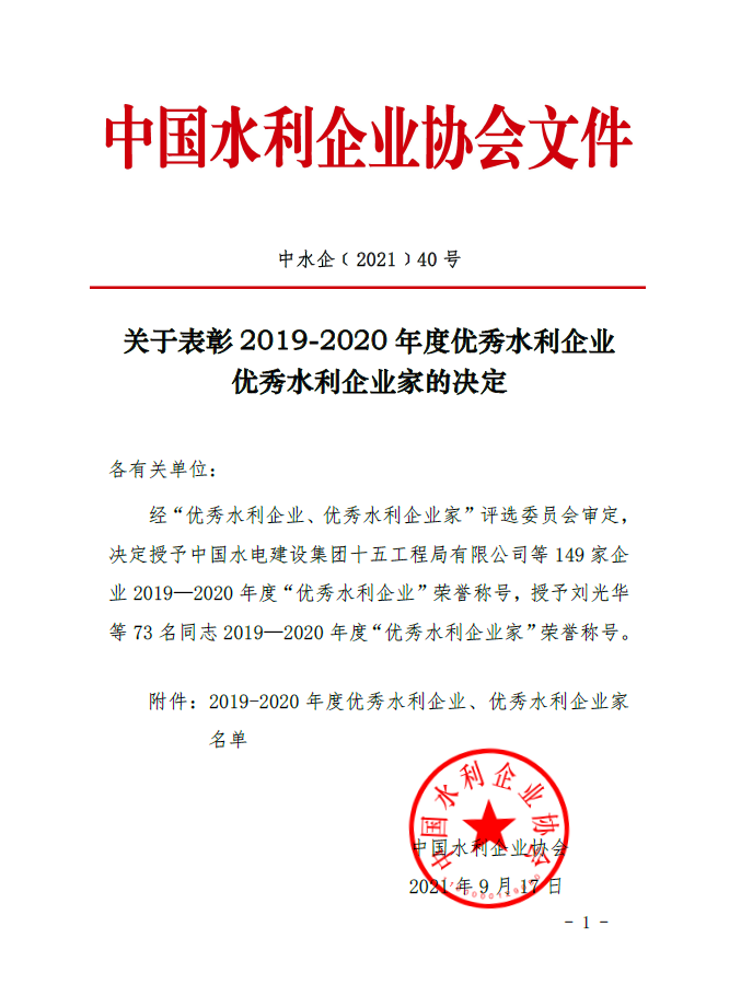 喜报 ▏公司荣获2019-2020年度优秀水利企业称号