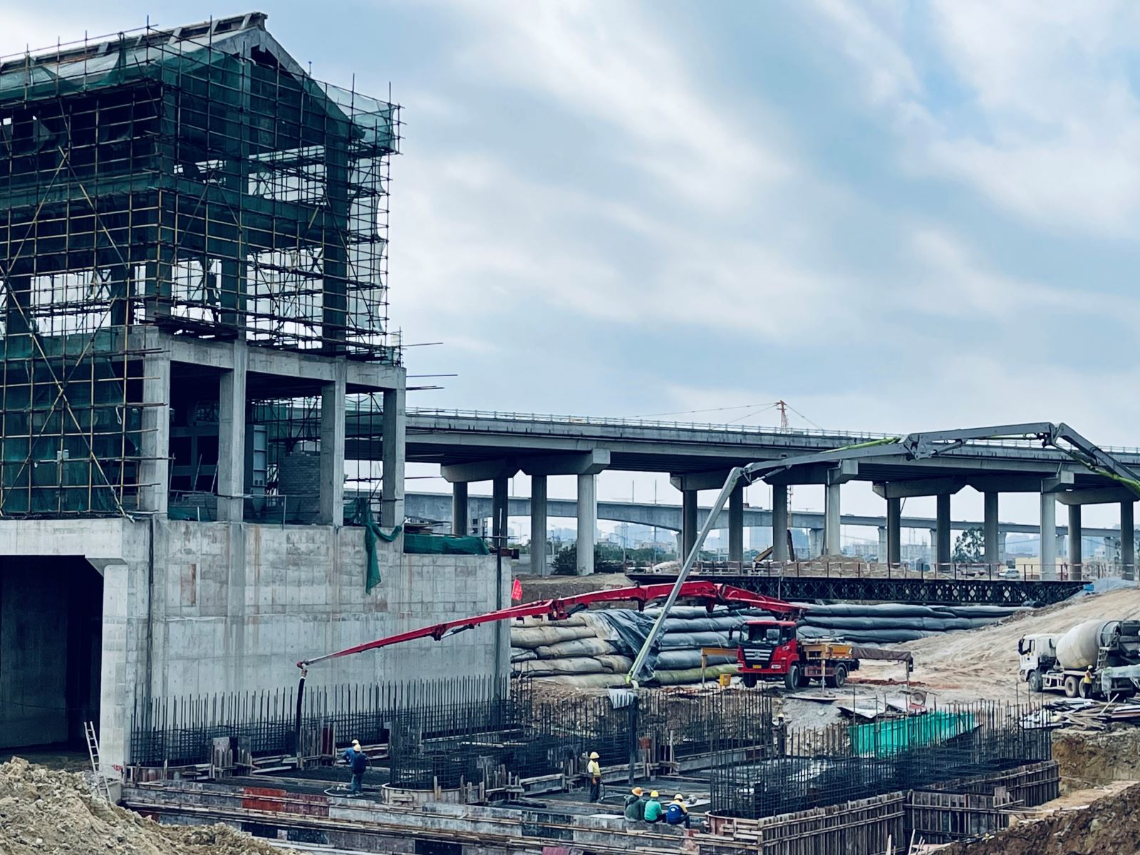 2021年11月13日,石狮市水头排涝枢纽工程施工现场一片繁忙景象,混凝土泵车伸展着“长臂”,工人们在各自的岗位上有条不紊地忙碌着,原来是水闸工程二期6#、7#孔正在进行闸室底板混凝土浇筑施工。