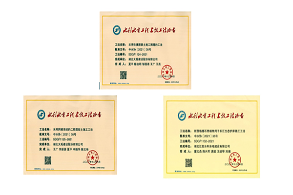 2021年12月,中国水利工程协会发布了《关于公布2021年度水利行业工法的通知》。本年度公司共申报了七项工法,其中申报的《采用吹填膜袋土施工围堰的工法》、《采用网模系统的二期混凝土施工工法》及《新型格栅石垫植物用于长江生态护岸施工工法》三项工法被评为2021年度中国水利行业工法,并颁发了水利水电工程建设工法证书。