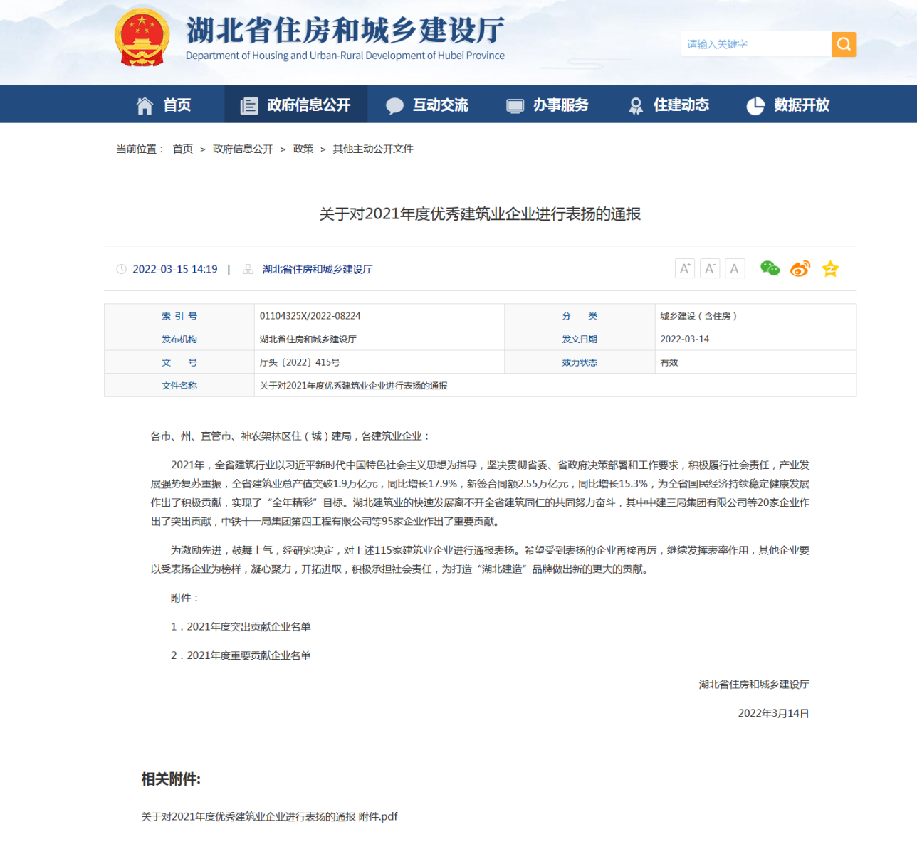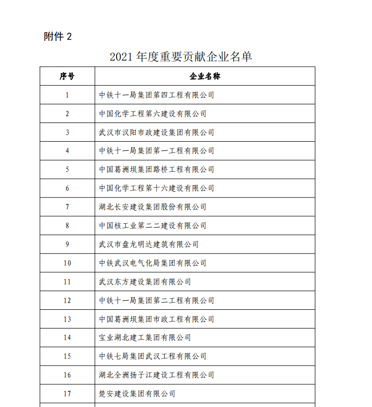 近日,湖北省住房和城乡建设厅官网发布了《关于对2021年度优秀建筑业企业进行表扬的通报》”,公司荣获2021年度重要贡献企业称号,获得本次的通报表扬进一步提升了公司在湖北省建筑业的行业地位。