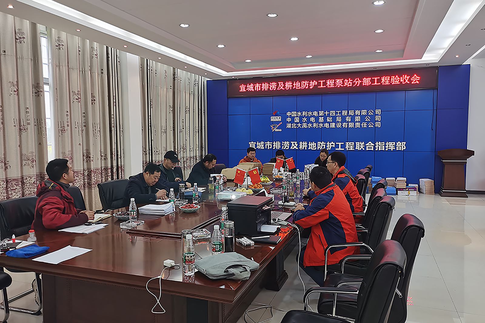 ​       3月19日,城市雅口航运枢纽库区复建工程项目办公室组织宜城市水利局、市质量与安全服务中心、设计单位、监理单位及施工单位等相关部门召开了由我公司承建龙头泵站、野鸡城泵站、沽河口泵站、龚垴泵站等4座新建泵站土建部分16个分部工程验收会议。