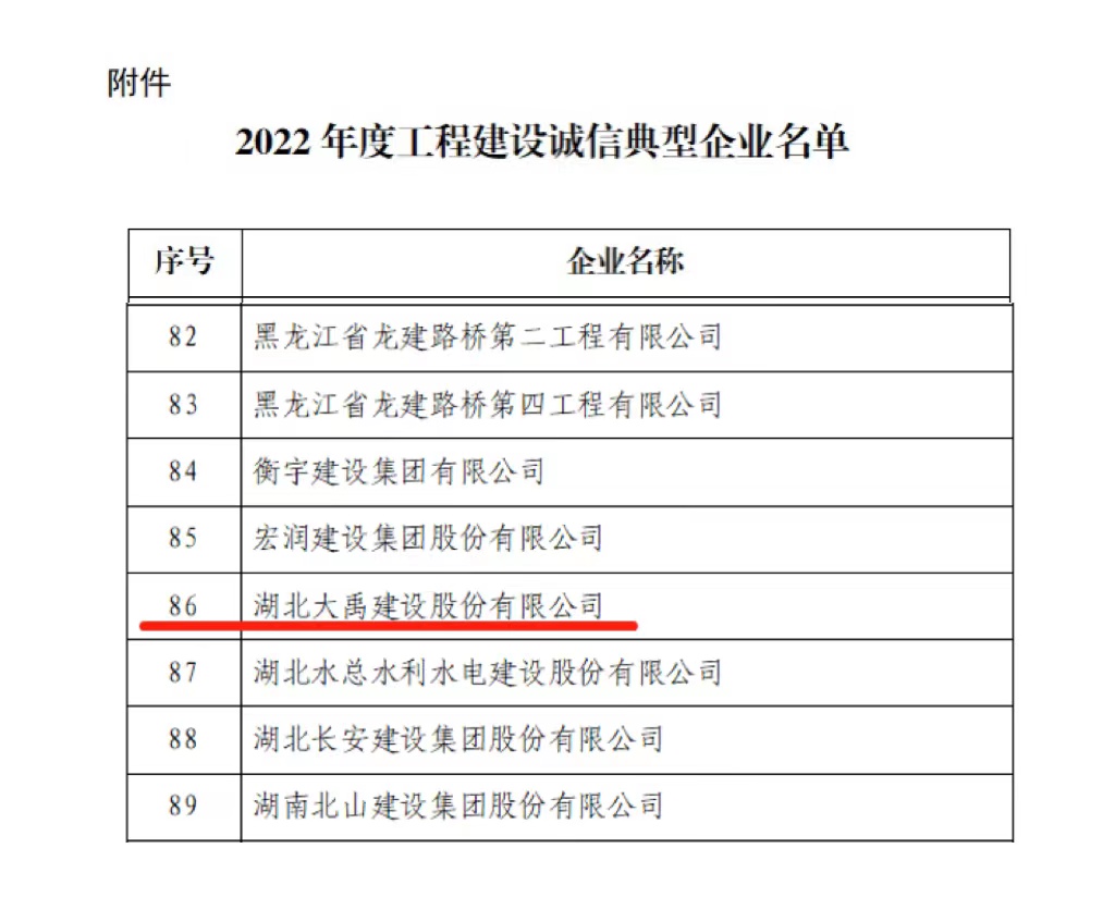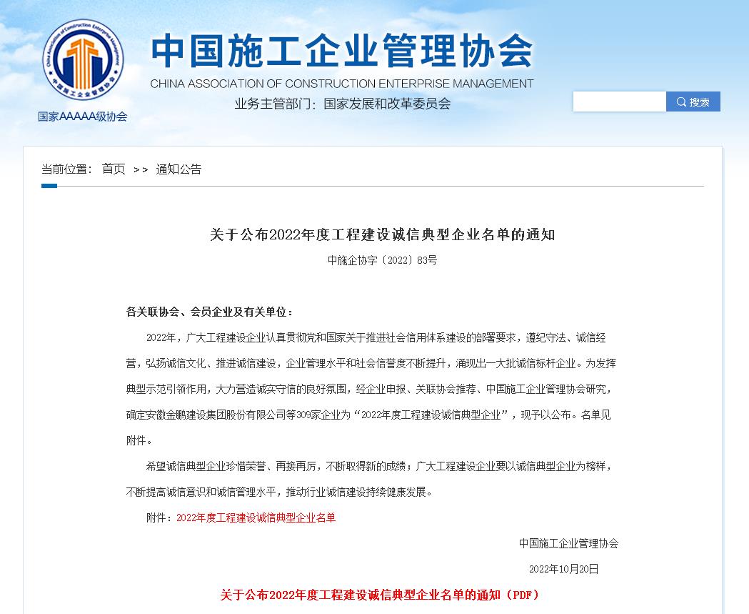 今日,接到中施企协字〔2022〕83号“关于公布2022年度工程建设诚信典型企业名单的通知”,公司获得“2022年度工程建设诚信典型企业”荣誉称号。