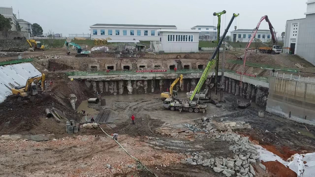 嘉鱼县余码头泵站更新改造工程地基基础处理及降水工程能否保质、保安全、保进度地施工一直牵动着公司领导的心。11月21日上午,公司副总经理李长华、曾广然现场检查余码头老站拆除开挖后的深基坑,并指导余码头泵站地基基础灌注桩施工及截渗墙内降水施工。第一工程公司相关负责人等陪同检查。