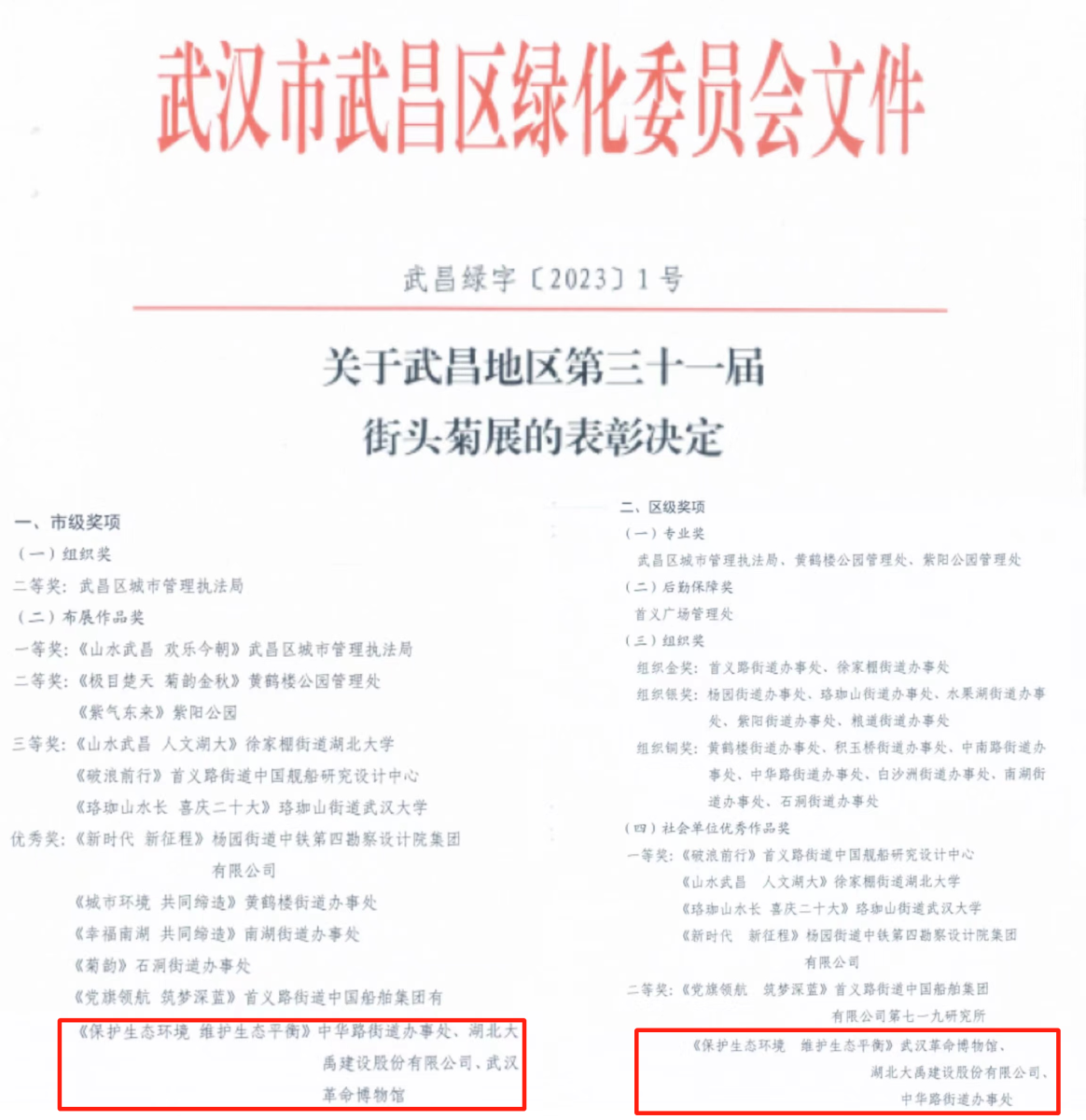 为充分展示武昌区第三十一届金秋菊展创作展出的优秀成果,进一步调动武昌区社会单位参展积极性和创造性,武汉市市、区园林部门分别组织了菊展参展作品专业评比,并在1月下旬经市武昌区绿色委员会发布了表彰决定。公司助展的菊展作品《保护生态环境 维护生态平衡》获评市级优秀奖及区级社会单位优秀作品奖。