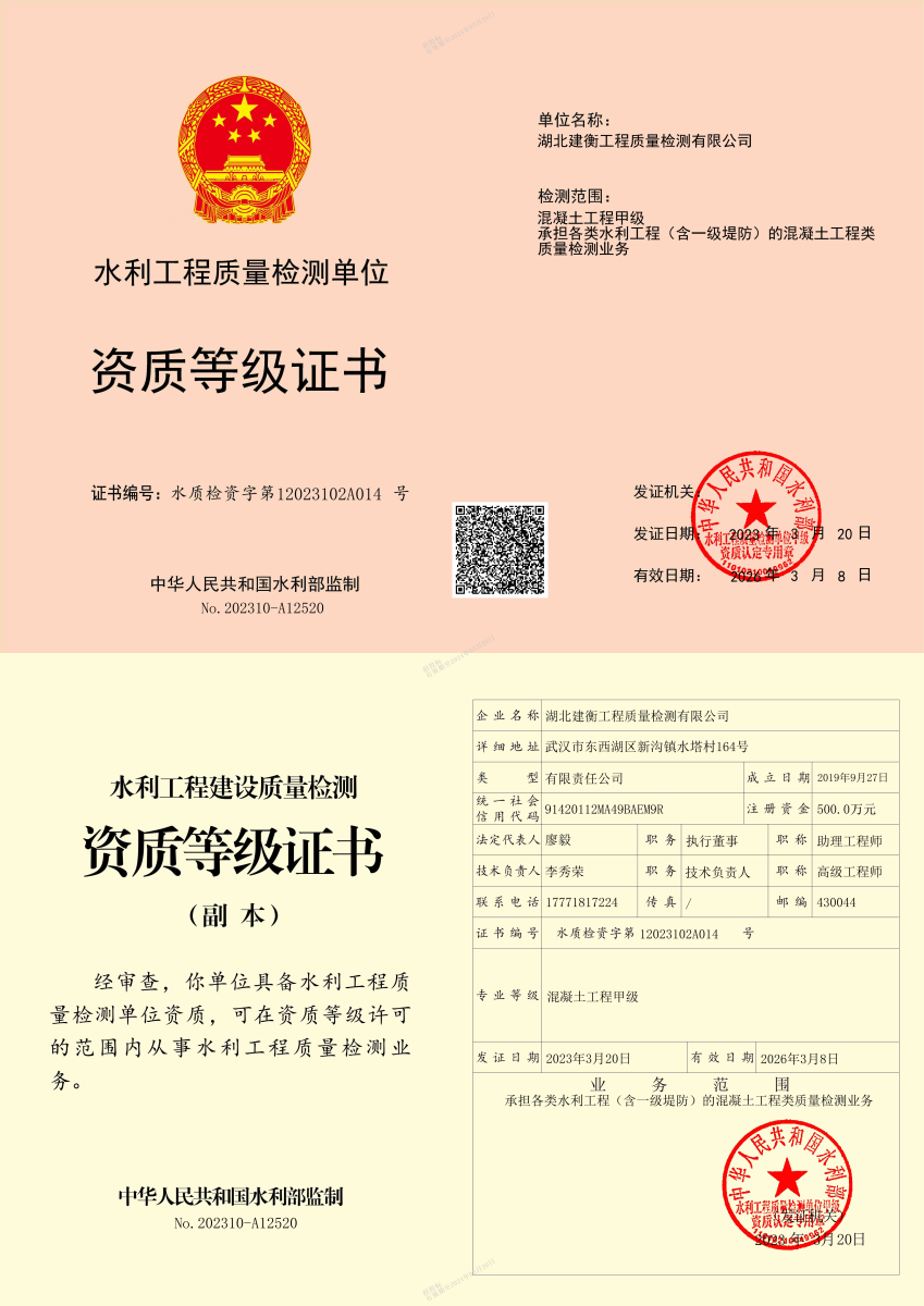 日前,根据水利部发布的《关于水利工程质量检测单位甲级资质准予行政许可决定的公告》,建衡检测公司顺利取得全国水利工程质量检测混凝土甲级资质,标志着建衡检测公司混凝土工程检测领域又上了一个新台阶。