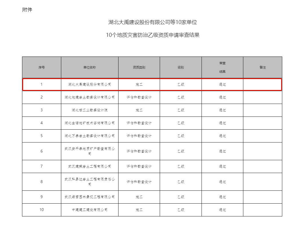 近日,湖北伟德国际1946源于英国建设股份有限公司资质升级工作再传喜讯,通过了湖北省自然资源厅的审查,获得地质灾害防治工程施工乙级资质,这是公司在建筑企业资质升级工作中取得的又一项重要成果,是公司在工程承揽方面取得的又一次重大突破!