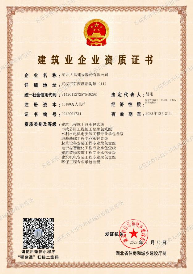 8月14日,由湖北省住房和城乡建设厅发布的《关于公布核准的建筑业企业资质名单的公告》获悉,公司专业承包资质申请获省住建厅核准通过,取得五项专业承包壹级资质。