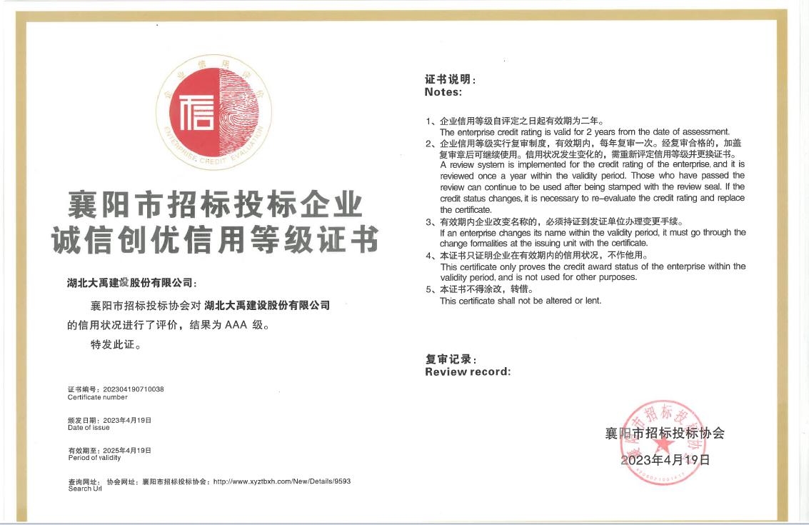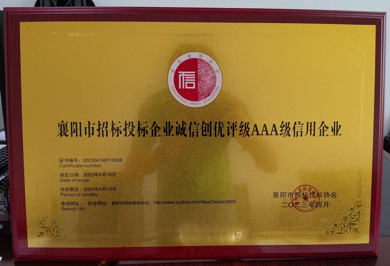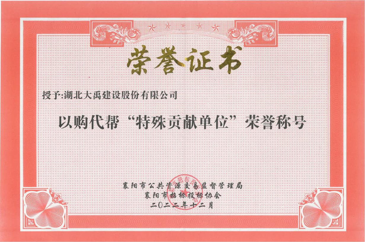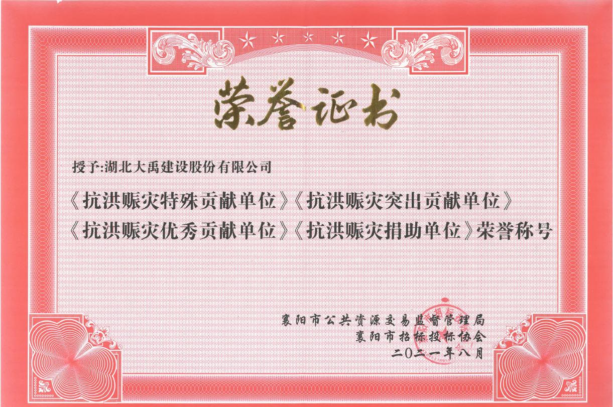 我公司很荣幸获得了2021年度《抗洪赈灾特殊贡献单位》、《抗洪赈灾突出贡献单位》、《抗洪赈灾优秀贡献单位》、《抗洪赈灾捐助单位》,2022年度以购代帮“特殊贡献单位”荣誉称号,2023年度襄阳市招标投标企业诚信创优评级AAA级信用企业等荣誉。