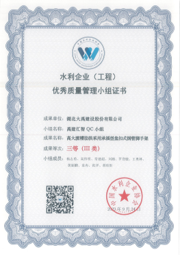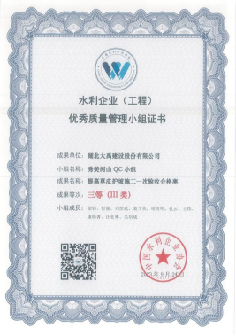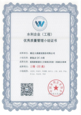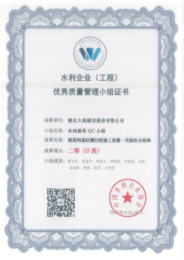 ​2023年9月,中国水利企业协会通过经初审、资料评价、发表评价和评价委员会审定,最终确定408项水利工程优秀质量管理小组成果,其中公司有6项成果获奖,问题解决型课题5个,创新型课题1个分别是《提高闸基砼灌注桩施工质量一次验收合格率》(荣获Ⅱ类成果)、《提高PVC排水管安装一次验收合格率》(荣获Ⅲ类成果)、《提高泵站高承压水下砼钻孔灌注桩施工Ⅰ类桩成功率》(荣获Ⅲ类成果)、《提高新建堤防土方填筑压实度一次验收合格率》(荣获Ⅲ类成果)、《提高草皮护坡施工一次验收合格率》(荣获Ⅲ类成果)、《高大渡槽肋拱采用承插型盘扣式钢管脚手架》(荣获Ⅲ类成果)。
