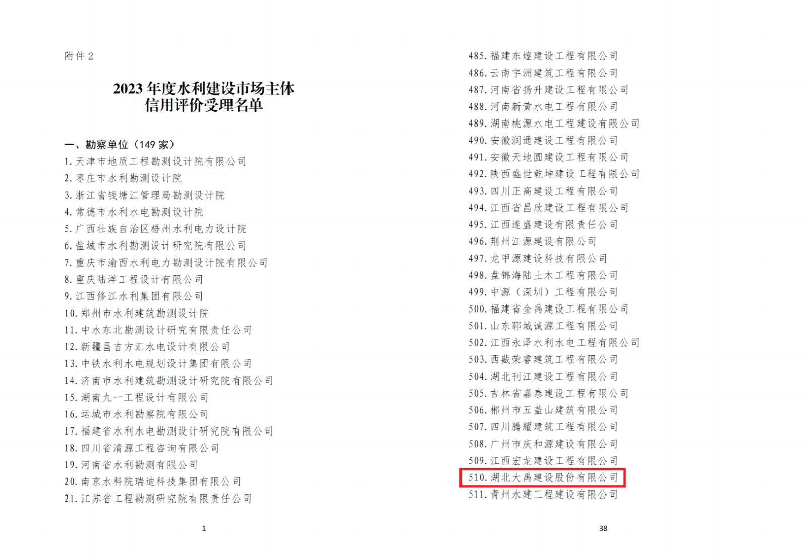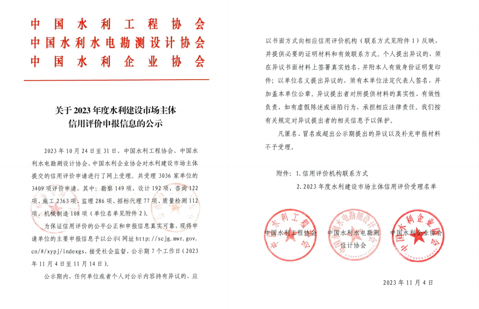 日前,中国水利工程协会发布《关于开展2023年度水利建设市场主体信用评价工作的通知》公告,面向参与水利建设的勘察、设计、施工、监理、质量检测、招标代理等单位广泛开展信用评价,公司积极参与并圆满完成本年度水利市场主体信用评价申报工作。