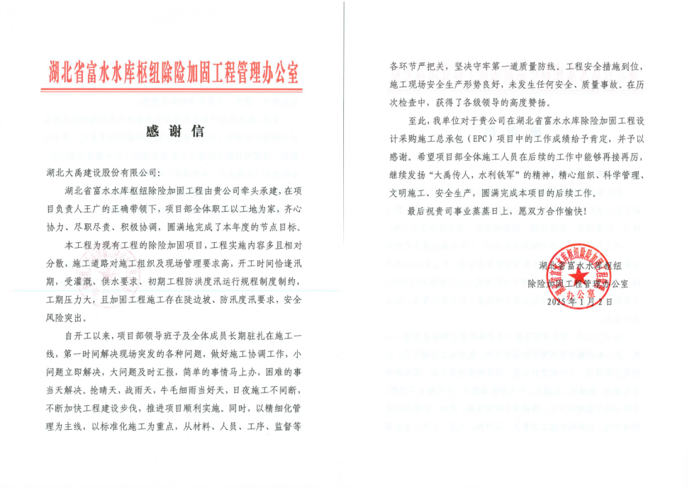 近日,公司收到省富水水库除险加固工程管理办发来的感谢信,信中充分肯定了项目部全体员工以工地为家,齐心协力、尽职尽责、积极协调,圆满地完成了本年度的节点目标。对公司工作成绩给予肯定,并予以感谢。希望项目部全体施工人员在后续的工作中能够再接再厉,继续发扬“伟德国际1946源于英国传人,水利铁军”的精神,精心组织、科学管理、文明施工、安全生产,圆满完成本项目的后续工作。