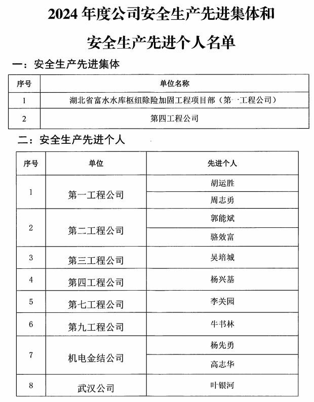 2024年,公司各部门、各生产经营单位认真贯彻落实“安全第一、预防为主、综合治理”方针,坚持以人为本、安全发展理念,深化专项整治、强化安全监管,顺利实现了公司年初确定的安全生产工作目标,全年生产安全无事故,有力地促进了公司生产经营活动持续、稳定、健康发展。公司安委会对各部门、各生产经营单位安全生产考核结果进行考评审核,决定授予湖北省富水水库枢纽除险加固工程项目部(第一工程公司)及第四工程公司2024年度安全生产先进集体荣誉称号,授予胡运胜等14位同志安全生产先进个人荣誉称号。希望受表彰的单位总结经验,发扬成绩,再接再厉,再创佳绩;未获得表彰的单位要查找差距,扎实做好安全生产各项工作,确保2025年公司安全生产形势进一步稳定好转,促进公司各项工作协调发展。
