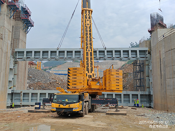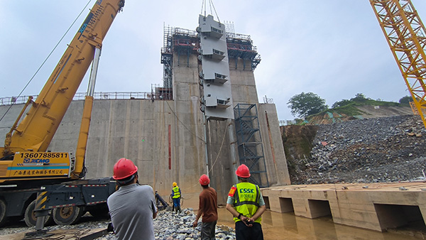 2025年5月28日下午,闸门右边梁先到施工现场,先进行了试吊然后正式步入吊装,通过现场工作人员的共同努力下使得第一分节右边梁顺利入门槽并初步定位。
