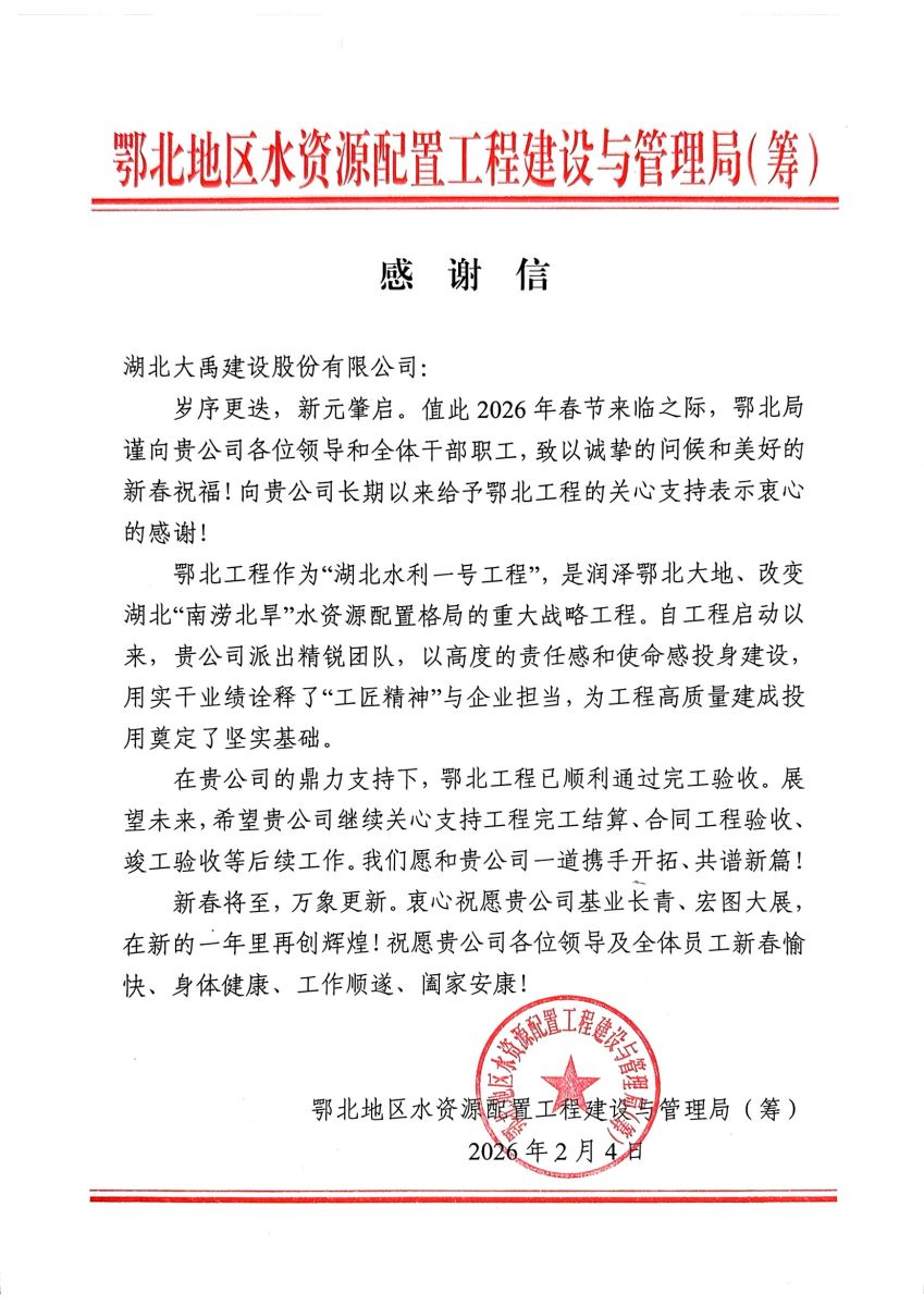 2月5日,公司收到来自鄂北地区水资源配置工程建设与管理局的感谢信。信中,鄂北局向公司致以诚挚的问候和新春祝福,并对公司长期以来对“湖北水利一号工程”——鄂北工程的鼎力支持与卓越贡献表示衷心感谢。